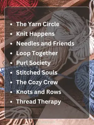 These names work well because they highlight what the group is about and create a warm friendly vibe. They use words like yarn thread loop and stitch which are naturally linked to knitting. They are also flexible enough for both casual friend groups and more formal knitting clubs.